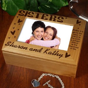 Personalized Sisters Photo Keepsake Box - Engraved Photo Keepsake Gift Our Personalized Photo Keepsake Box becomes your sister's personal treasure chest of memories. Be sure to share this beautifully Engraved Keepsake Box with all of your sisters. They all will love you for it. Each Personalized Keepsake Box is made from beautiful oak wood measuring 8 1/8" L x 6 1/8" W x3 5/8" H. The Personalized Keepsake Box is perfect for holding your special mementos, such as personal letters from friends, precious jewelry or keepsakes. The attractive photo keepsake box will accommodate your personal 4" x 6" photo. This personalized wooden photo keepsake box includes FREE Personalization with up to 6 names. Personalized Sister Keepsake reads: A Sister is a gift to the heart, a friend to the spirit, a golden thread to the meaning of life.